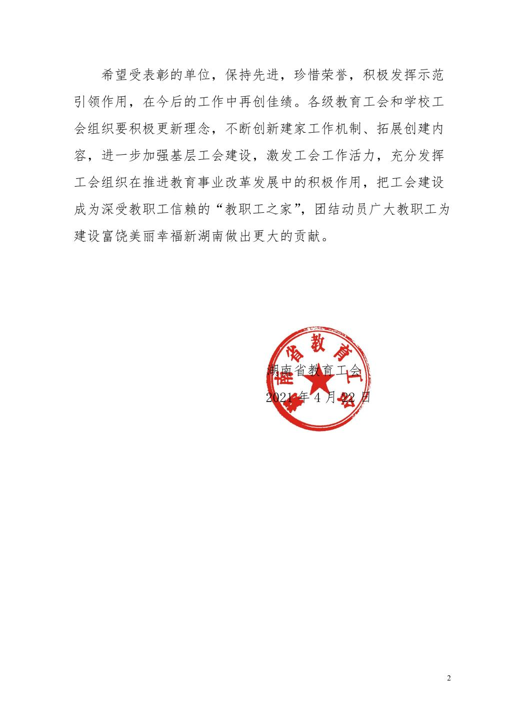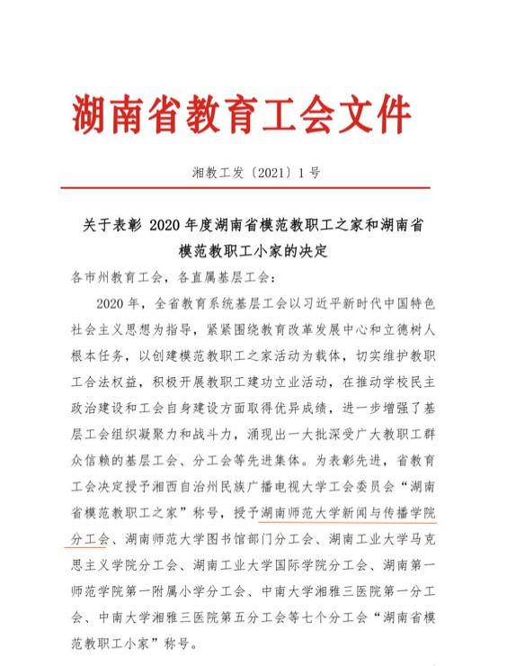 近日,湖南省教育工会发布《关于表彰2020年度湖南省模范教职工之家和湖南省模范教职工小家的决定》,402永利集团获评“湖南省模范教职工小家”荣誉称号,标志402永利集团工会工作取得新成效。