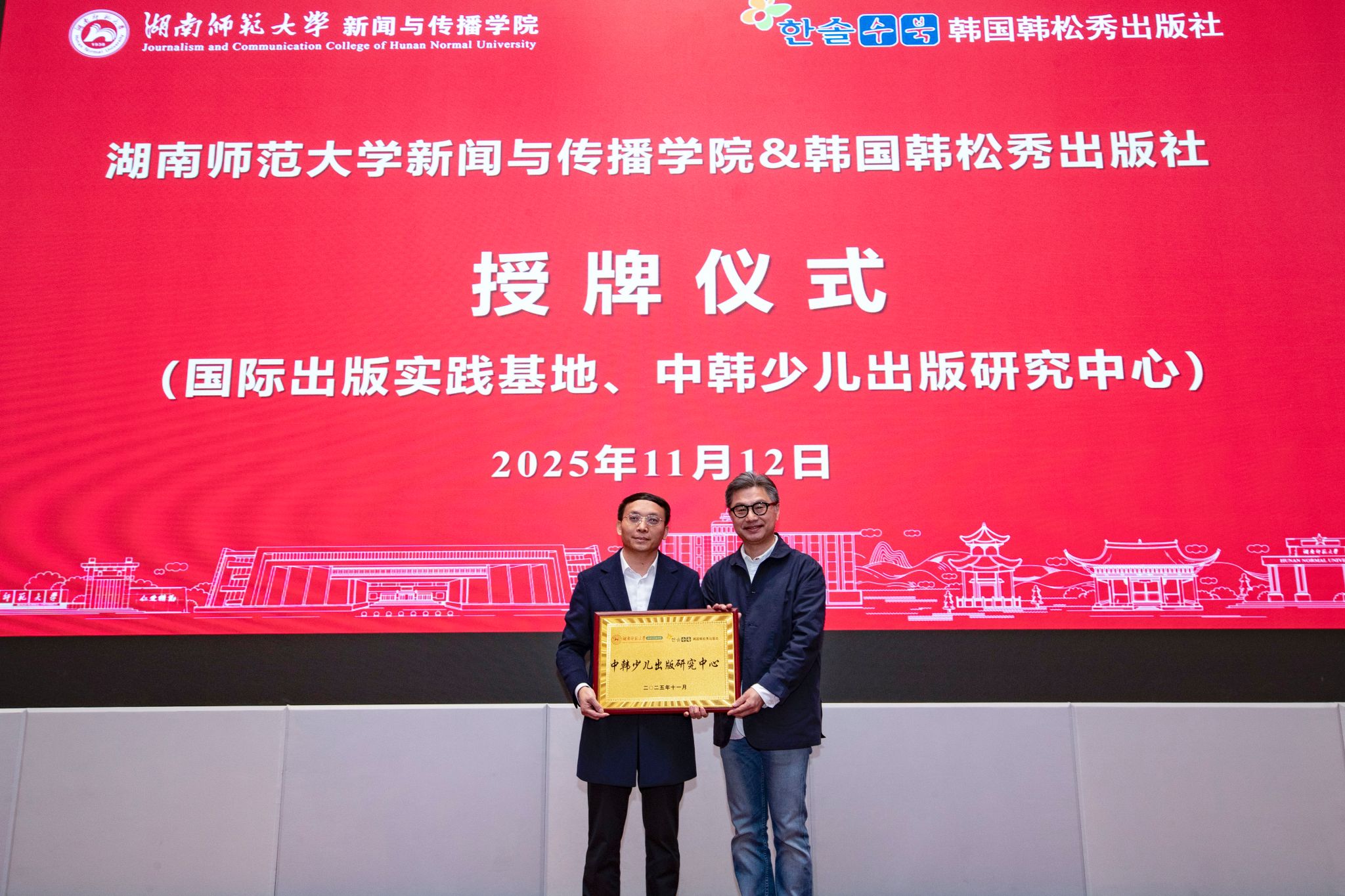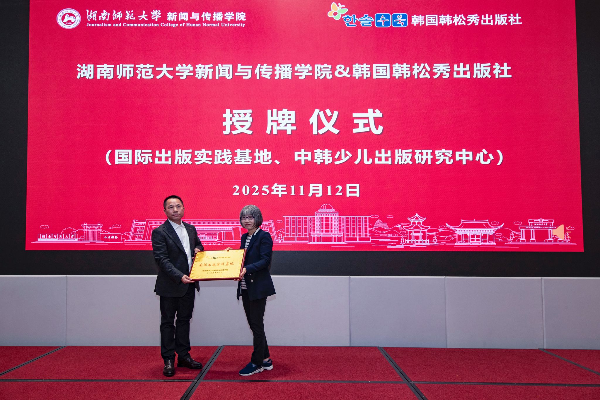 会议还举行了签约、授牌仪式。402永利集团副院长王海刚与韩国韩松秀出版社社长赵恩希签订产学研合作协议。周霞教授与韩国韩松秀出版社签署《不到山》图书项目中韩文同步出版合作备忘录。402永利集团副院长燕道成、王海刚分别为韩国韩松秀出版社授牌(“国际出版实践基地”“中韩少儿出版研究中心”)。402永利集团党委副书记张小春向三位韩国专家赠送韬奋杯全国图书编校技能大赛获奖作品《记忆里的歌——我们的长沙童谣》绘本。