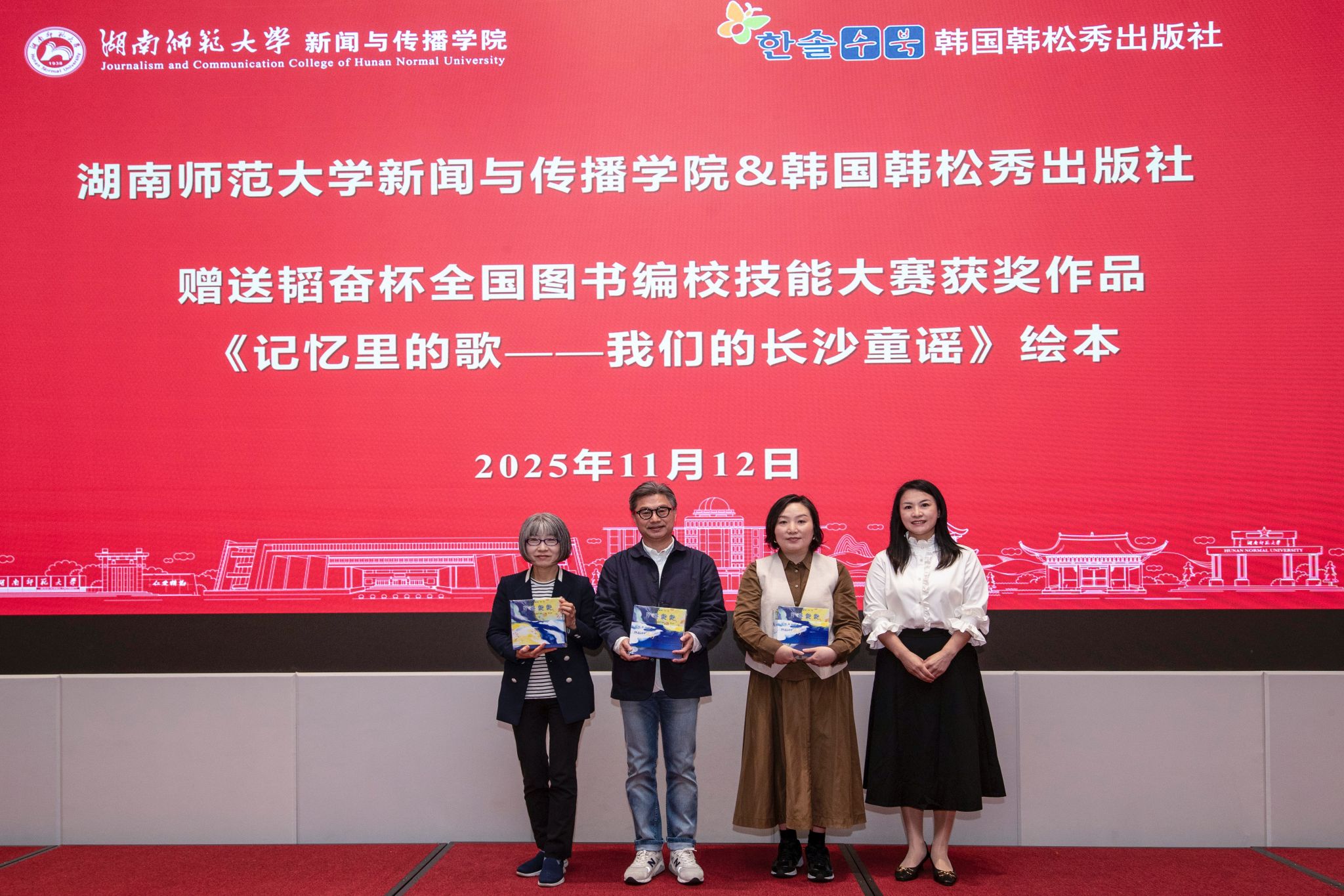 402永利集团党委副书记张小春向三位韩国专家赠送韬奋杯全国图书编校技能大赛获奖作品《记忆里的歌——我们的长沙童谣》绘本。