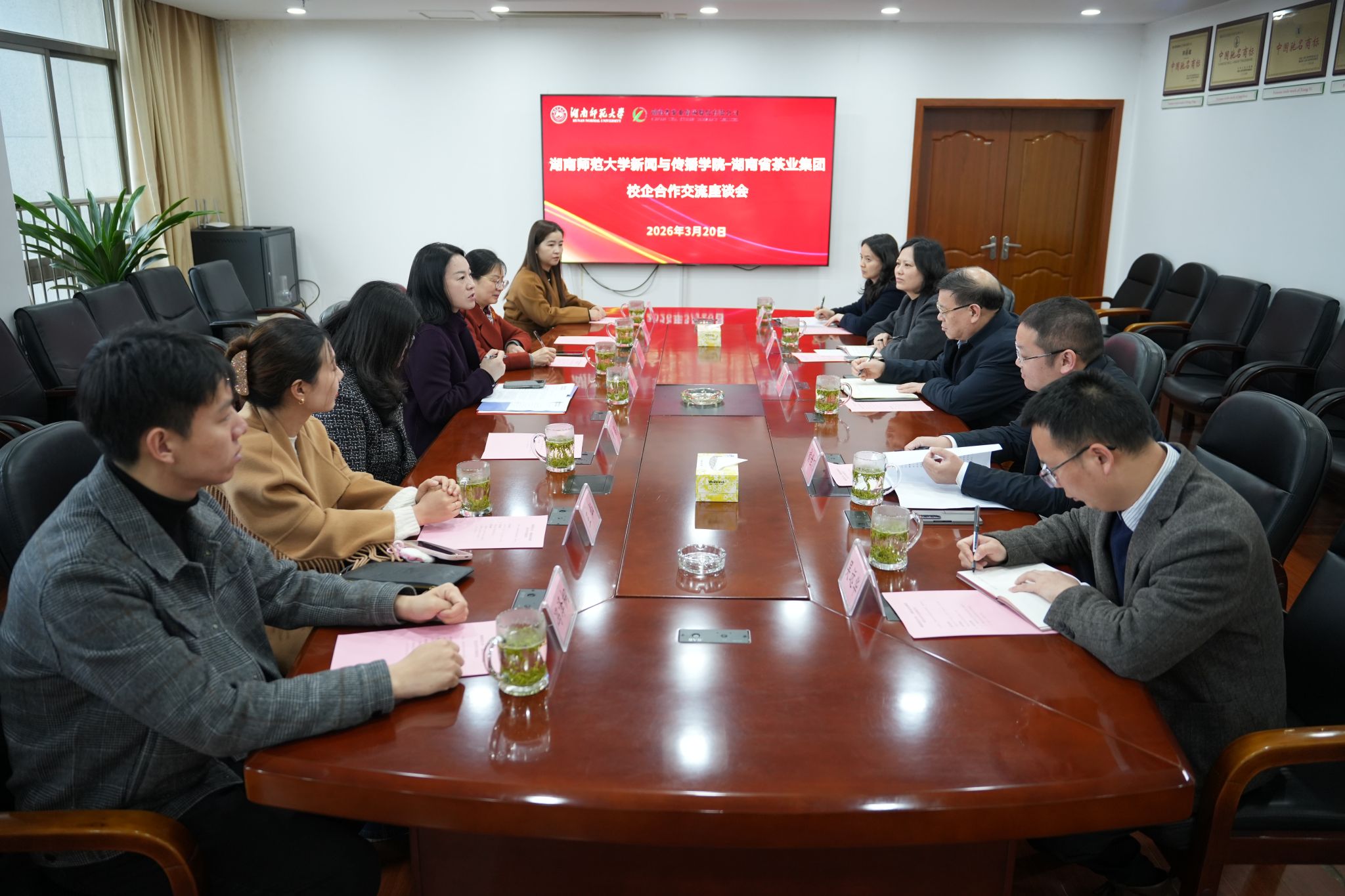 (通讯员 冯泽桐)为深入贯彻落实党中央、国务院关于高校毕业生就业工作的决策部署,扎实推进教育部“访企拓岗促就业”专项行动,进一步深化产教融合、校企协同育人,精准对接行业人才需求,3月20日,学402永利集团副书记张小春带队,播音与主持艺术系主任颜湘君、视听传媒系主任岳璐、播音与主持艺术系教师李艳、视听传媒系教师王灿、院团委书记陈安琪、2022级辅导员冯泽桐一行赴湖南省茶业集团开展访企拓岗专题调研。湖南省茶业集团党委书记、董事长周重旺,集团党委委员、纪委书记、工会主席褚世炯,人力资源部经理李娟、湖南省茶叶博物馆馆长易蓉、集团党办主任吴远华、办公室常务副主任丁年华、团委书记朱元福等相关领导参加座谈交流。