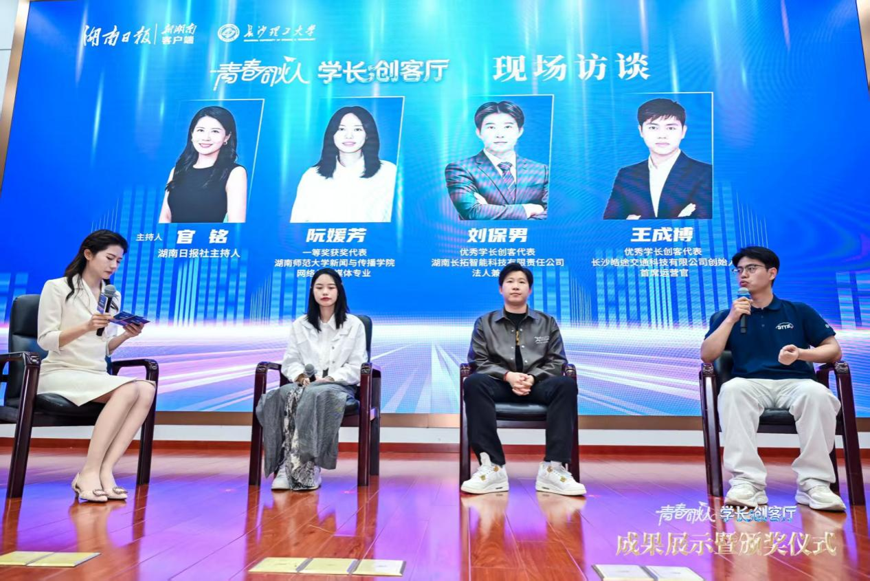 本次活动自2025年3月启动,在省委宣传部、省教育厅、团省委的指导和大力支持下,湖南日报社依托“青春合伙人”项目,推出“学长创客厅”主题报道行动。全省26所高校的新传学子用镜头记录下72期鲜活的创业故事,拼绘出湖湘青年奋发有为的青春群像。活动现场还举行了“学长创客厅”访谈,402永利集团一等奖作品团队成员阮媛芳作为唯一参赛选手代表分享了创作经历,讲述了镜头背后的采访故事与青年视角下的创业观察。