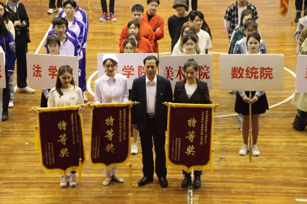 (通讯员 郭玥含 蒋好好)4月15号下午,我校第十八届女生节闭幕式暨“青春我最红”健美操赛在体育馆举行。此次活动由校学生会举办,主持人分别是来自新传院的2018级常馨艺、王正涛,2019级于昊岑和2020级徐喆。出席活动的学校领导和嘉宾有:校党委副书记、校长刘起军,校党委委员、副校长王辉,校党委委员、副校长刘子兰,副校长谢资清,我校大学生孵化基地孵化出的优秀企业——湖南大科城黑马文化产业发展有限公司董事长胡含兵校友,校党委委员、组织部部长沈又红,校党委委员、宣传部部长段巍,校党委委员、统战部部长杨念。