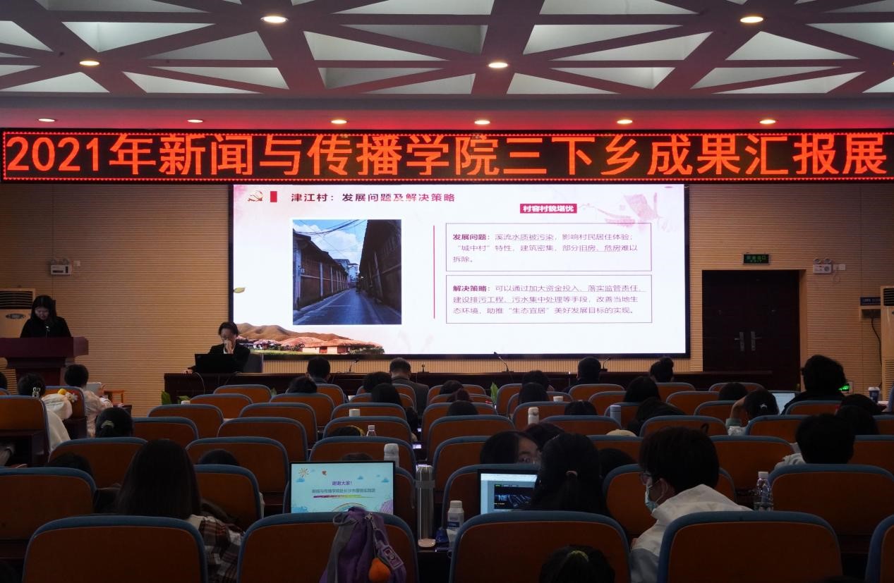 九支汇报队伍依次上台进行汇报展示。九支团队的选题涉及中小学生体质教育、推普活动、红色文旅、儿童心理、老人与智能手机、农村女性抖音带货等多项内容,采取多种汇报形式,例如纪录片、口头汇报、情景剧、唱红歌等展示了他们的实践成果。