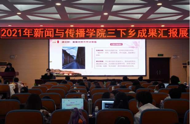 九支汇报队伍依次上台进行汇报展示。九支团队的选题涉及中小学生体质教育、推普活动、红色文旅、儿童心理、老人与智能手机、农村女性抖音带货等多项内容,采取多种汇报形式,例如纪录片、口头汇报、情景剧、唱红歌等展示了他们的实践成果。